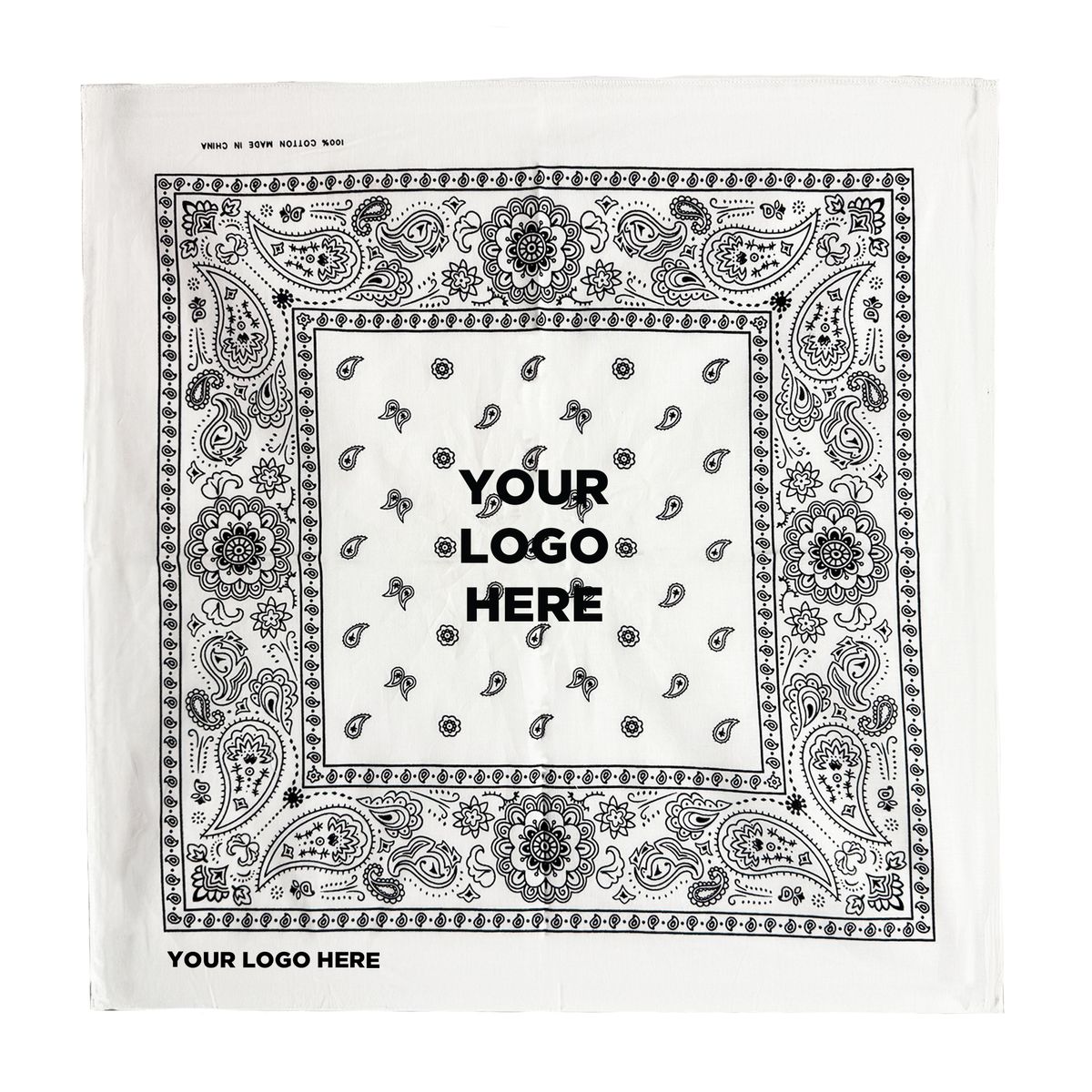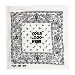 White cotton bandana, 22" x 22". Priced per bandana but please order increments of 1 dozen.